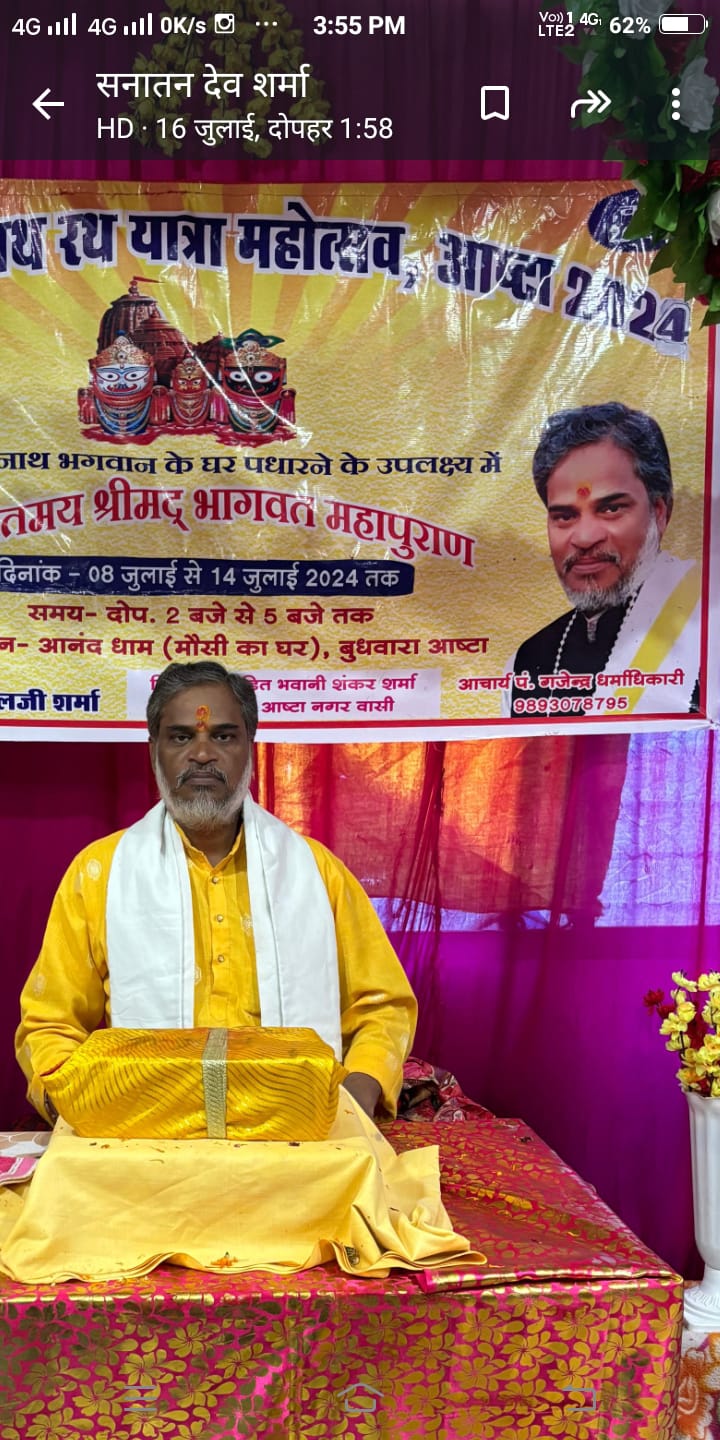 आचार्य पंडित गजेंद्र धर्माधिकारी जी (आष्टा, जिला सीहोर) एक अनुभवी वैदिक विद्वान, ज्योतिषाचार्य, कर्मकांडी एवं संस्काराचार्य हैं, जो कई वर्षों से भोपाल और आष्टा क्षेत्र में धार्मिक अनुष्ठान, हवन, कथा, संस्कार और ज्योतिष परामर्श करा रहे हैं। इन्होंने वेद, ज्योतिष और सनातन संस्कृति के अध्ययन में गहन साधना की है और अपनी शिक्षा के रूप में आचार्य (ज्योतिष), एम.ए. (संस्कृत), आचार्य (संस्कृत) और बी.एड. की उपाधियाँ प्राप्त की हैं। पूजा-पाठ में शुद्ध वैदिक विधि, स्पष्ट नियम, और ऐसी भाषा का उपयोग करते हैं कि हर व्यक्ति आसानी से समझ सके और जुड़ सके — यही उनकी विशेष पहचान है।